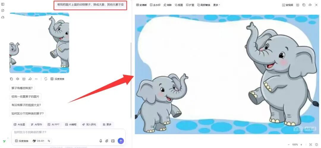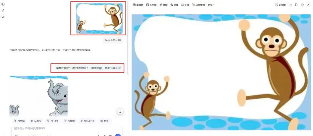 举个简单的例子:如果课件里有一张PPT,上面的卡通动物是猴子,你想换成大象,只需要给AI输入一句指令:“把这张PPT里的猴子换成大象,其他元素保持不变”。