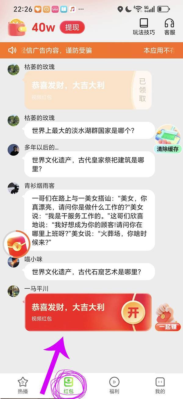 第3步:点击底部的“红包”,然后开始挣钱!有红包弹出来,就点开,然后看15秒到30秒广告,广告结束后直接领取金币。如下图: