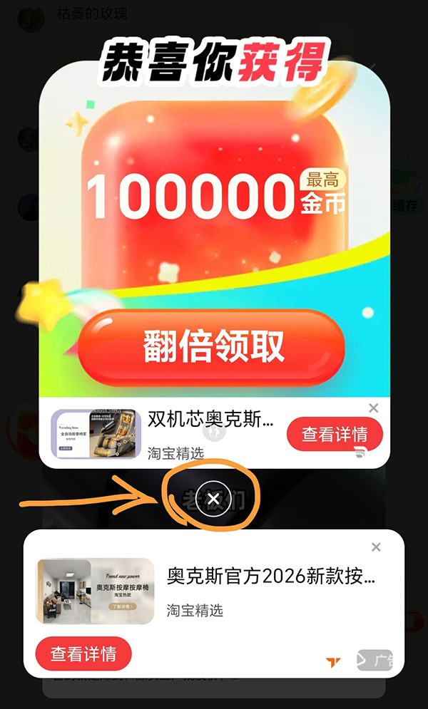 特别提醒:如果你之前手机上安装过抖音极速版、快手极速版等看广告赚金币的软件,做锦鲤的时候弹出来的广告大多数都是让你下载APP的,而且单价很低,遇到这种情况,要么换个手机,要么恢复出厂设置,要么打开淘宝,搜索一些单价大于5000的贵重物品,认真浏览并收藏+添加购物车,你的广告单价就会高了,而且出现的广告也都不是下载类的广告了。