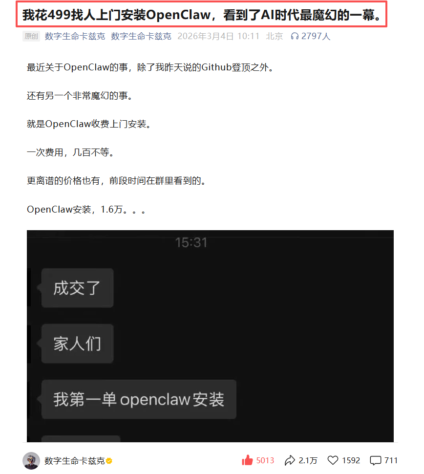 最近,OpenClaw这玩意儿突然就爆了,刷屏刷得厉害,感觉搞科技的自媒体没一个落下,都在聊。 这场景,一下就把我拉回去年春节那会儿了。还记得不?那时候DeepSeek也是这么横空出世的,一下子把所有人都给震住了。 当时我就观察到一个特别有意思的现象。DeepSeek刚火没两天,小红书上一堆人就开始卖教程、卖提示词合集了。什么清华那本104页的《DeepSeek:从入门到精通》PDF,愣是在小红书上卖出去好几千份。淘宝和闲鱼上,更是冒出无数提供“本地部署”服务的商家。 说实话,那些动手早的,是真真切切赚到钱了。而且他们赚的是什么钱?说白了,就是纯粹的信息差——我知道你不知道,我帮你搞定,你付钱。再后来,跟AI沾边的各种工具、教程、新玩法,就像雨后春笋一样,被包装成各种各样的虚拟产品卖。 现在,OpenClaw又来了。这说明啥?机会这东西吧,其实一直都有,从来没缺席过。可惜的是,大部分人反应太慢了。等你琢磨明白,想好怎么下手的时候,不好意思,红利期早就过了。 而且这次OpenClaw跟DeepSeek还不一样。它的技术门槛更高,普通用户想上手?难。但这恰恰给想搞点事情的人,尤其是想做虚拟电商的朋友,留出了更大的空间。 一、OpenClaw到底是啥? 你就把它理解成一个真正能帮你“干活”的AI,就对了。 它和咱们平时用的ChatGPT这类聊天机器人不一样。你问ChatGPT问题,它给你答案,像个顾问。但OpenClaw不一样,它更像《钢铁侠》里的那个管家贾维斯。你给它下一个指令,比如“帮我写个小工具,再顺便做个官网的草稿”,它就能像真人一样,自己操作电脑,咔咔一顿点,把事情给你办妥了。你睡一觉,第二天醒来,活儿已经干完了。 那它为啥突然就火了呢? 原因特简单:它解决了过去两年AI最让人难受的一个问题——“光说不练”。 以前的AI,甭管是ChatGPT还是Claude,本质上都只是个“嘴强王者”。它能给你出主意、搭框架,但真要动手干,还得你自己来。比如你想让它帮你整理一份竞品分析报告,它能把框架给你整得明明白白,但打开网页查数据、复制粘贴、整理到表格里,这些苦力活,一件都落不到它头上。 OpenClaw不一样,它是真的能动手的AI。你把电脑的操作权限给它,它就能像人一样,控制你的鼠标去点,用键盘去敲,去运行程序,真干活。 所以技术圈的人看到它才这么激动,因为这才是大家心里真正想要的AI啊! 但是,重点来了:OpenClaw这东西,部署和使用起来,门槛是真不低。 它不像ChatGPT那样,打开网页就能用。OpenClaw得在你自己电脑上部署,需要懂点技术,普通用户自己折腾,很容易就卡住了。 有门槛,就意味着有机会。 你看,市场上马上就有人开始提供“代部署”服务了,价格从几十块钱的远程帮你弄,到几百块钱的上门帮你配置好,啥价位都有。我上淘宝扫了一眼,有人卖OpenClaw的部署服务,单价几十到几百,月销量已经破千了。 还有人已经开始搞付费社群,专门教大家怎么用OpenClaw来提高工作效率。 这不就是典型的信息差生意嘛。技术门槛越高,普通用户越需要人帮忙,这里面的变现空间就越大。 所以我说,各行各业其实都挺适合做虚拟电商的。特别是你但凡懂点技术,把自己的专业技能包装成一个服务或者一套教程,就能拿来卖。 二、具体的需求在哪儿? (1) 技术门槛拦路:OpenClaw虽然是开源的,但让普通人去配置环境变量、安装依赖包、再优化各种参数,确实有点强人所难了。会的人觉得简单,十分钟搞定;不会的人,真的是两眼一抹黑,第一步就卡死了。 (2) 怕麻烦、想省时间:想把这只“龙虾”(OpenClaw)养好,还得持续花钱。云服务器、API调用、电费、存储,七七八八加起来,每个月开销也不少。如果想用体验更好的模型,成本还得往上涨。 对于很多有一定经济能力的人来说,花个几百块钱,省下自己好几天瞎折腾研究的时间,这笔账太划算了。他们要的是马上就能用起来,而不是省那几百块钱。再说,万一自己研究半天,钱花了还没搞好,多闹心。与其自己踩坑,不如花钱买份安心。 (3) 后续维护也是事:别以为找人帮忙部署好就万事大吉了。这玩意儿更新挺勤的,经常得重新配置。每次更新,可能就又需要人帮忙了。这后续的服务需求,也是源源不断的。 三、最适合新手的3种玩法 (1) 卖文档、卖教程(最简单) 最直接粗暴的玩法,就是整理资料。 OpenClaw虽然有官方文档,但对小白来说,看着还是头疼。你可以把部署的每一步,写成那种“傻瓜式教程”,配上截图,做成图文或者录成视频。比如怎么配置环境、怎么搞API密钥、怎么选模型、怎么调参数,每个环节都会有人遇到问题。 如果你自己就是个小白,确实不会部署,怎么办? 更简单!把现成的教程整理成文档,这你总会吧。 去抖音、小红书、B站,搜一下“OpenClaw部署”,找几个点赞高的视频,仔细看人家是怎么操作的。 很多视频讲得已经非常详细了。你就跟着他们的步骤,自己跑一遍,然后把过程截图,整理成文档就行。如果实在懒得自己动手写,直接用AI工具把视频内容总结一下,再让AI帮你优化润色成一篇图文教程。 卖教程,已经是最简单的一种玩法了。本质上就是我们常说的“二创”。网上其实有大量免费公开的文档、手册、教程,你都可以把它们收集起来,用自己的话重新整理一遍。 这类教程制作成本很低,主要就是花点时间,但需求量不小,你看之前DeepSeek火的时候那卖教程的盛况就知道了。价格一般定在4.9到19.9元之间,卖得不贵,